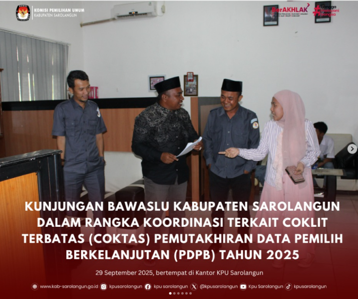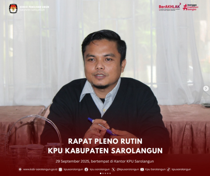 Sarolangun, kab-sarolangun.kpu.go.id - Komisi Pemilihan Umum (KPU) Kabupaten Sarolangun melaksanakan Upacara Memperingati Hari Kesaktian Pancasila pada tanggal 1 Oktober 2025. Rabu, (1/10/25) Anggota KPU Kabupaten Sarolangun Divisi Hukum dan Pengawasan, Riyandi Kurniawan, bertindak sebagai Pembina Upacara dalam peringatan hari bersejarah ini. Upacara berlangsung khidmat, menunjukkan komitmen KPU Sarolangun dalam menjaga keutuhan ideologi Pancasila. Turut hadir dalam upacara tersebut Anggota KPU Sarolangun lainnya, yakni Divisi Sumber Daya Manusia dan Partisipasi Masyarakat (SDM dan Parmas) Yuliana, Divisi Teknis Penyelenggaraan Pemilu Ari Wibowo dan Plh Sekretaris Mutiyah Pitri, Para Kasubbag, Pejabar Fungsional Ahli Muda serta seluruh Aparatur Sipil Negara (ASN) Sekretariat KPU Kabupaten Sarolangun. Peringatan hari Kesaktian Pancasila. ini diharapkan dapat menjadi momentum untuk meningkatkan semangat kebangsaan dan memperkuat integritas seluruh staf KPU Sarolangun dalam menjalankan tugas-tugas. (humas drs/foto cholied/ed Mutiyah)