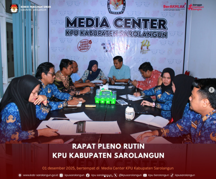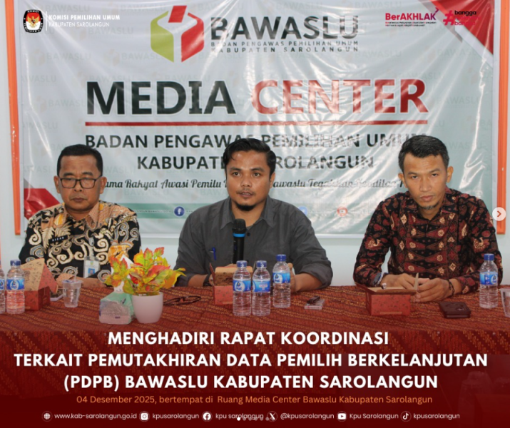 Sarolangun, kab-sarolangun.kpu.go.id - Ketua dan Anggota Komisi Pemilihan Umum Kabupaten Sarolangun beserta Kepala Subbagian Perencanaan, Data, dan Informasi menghadiri Rapat Koordinasi yang diselenggarakan oleh Badan Pengawas Pemilihan Umum Kabupaten Sarolangun pada Kamis, 4 Desember 2025. Rakor yang bertempat di Ruang Media Center Bawaslu Kabupaten Sarolangun ini fokus membahas Pemutakhiran Data Pemilih Berkelanjutan (PDPB). Kehadiran jajaran KPU Kabupaten Sarolangun dalam Rakor ini menunjukkan komitmen kuat dalam menjaga dan meningkatkan kualitas data pemilih di wilayah Sarolangun. Kualitas data yang akurat dan mutakhir merupakan fondasi utama dalam menjamin hak konstitusional warga negara untuk memilih, serta menjaga integritas setiap tahapan pemilihan yang akan datang. (humas drs/foto cholied/ed Mutiyah) Dalam pertemuan tersebut, KPU dan Bawaslu serta Dinas Dukcapil Sarolangun mendiskusikan berbagai mekanisme dan tantangan dalam pelaksanaan PDPB, termasuk sinkronisasi data dengan instansi terkait. Hasil rakor diharapkan dapat menjadi panduan operasional bersama untuk memperkuat validitas data pemilih hingga menjelang tahapan Pemilu yang akan datang.