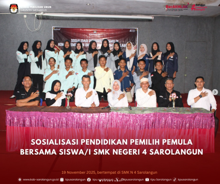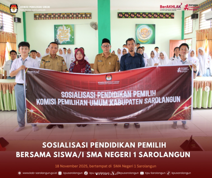 Sarolangun, kab-sarolangun.kpu.go.id - Komisi Pemilihan Umum Kabupaten Sarolangun melaksanakan kegiatan Sosialisasi Pendidikan Pemilih Pemula bersama Siswa/i SMA Negeri 1 Sarolangun, Selasa, 18 November 2025. Kegiatan yang bertempat di Gedung SMA Negeri 1 Sarolangun ini dibuka langsung oleh Anggota KPU Kabupaten Sarolangun Divisi Sosdiklih Parmas Yuliana didampingi Divisi Teknis Penyelenggaraan Ari Wibowo. Dalam sambutannya Yuliana menekankan bahwa pemilih pemula adalah generasi kunci yang akan menentukan arah masa depan bangsa. Oleh karena itu, mereka dihimbau untuk menjadi pemilih yang cerdas, serta tidak mudah terpengaruh oleh informasi yang tidak benar (hoaks). Pada sosialisasi ini KPU Kabupaten Sarolangun menghadirkan pemateri dari Dinas Kependudukan dan Catatan Sipil Kabupaten Sarolangun, Riduan, S.STP, M.E. Kepala Dinas Kependudukan dan Catatan Sipil Kabupaten Sarolangun hadir langsung sebagai narasumber pada kegiatan ini. KPU Sarolangun berharap kegiatan serupa dapat terus dilaksanakan di sekolah-sekolah lain untuk memastikan seluruh pemilih pemula siap berpartisipasi dalam pesta demokrasi yang akan datang. (humas drs/foto cholied/ed Mutiyah)