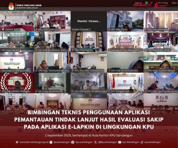 Sarolangun, kab-sarolangun.kpu.go.id - Komisi Pemilihan Umum (KPU) Kabupaten Sarolangun mengikuti Bimbingan Teknis Penggunaan Aplikasi E-LAPKIN Pemantau tindak lanjut hasil evaluasi SAKIP pada Aplikasi E-LAPKIN di lingkungan KPU yang diselenggarakan oleh KPU Republik Indonesia. Selasa, (16/9/2025).