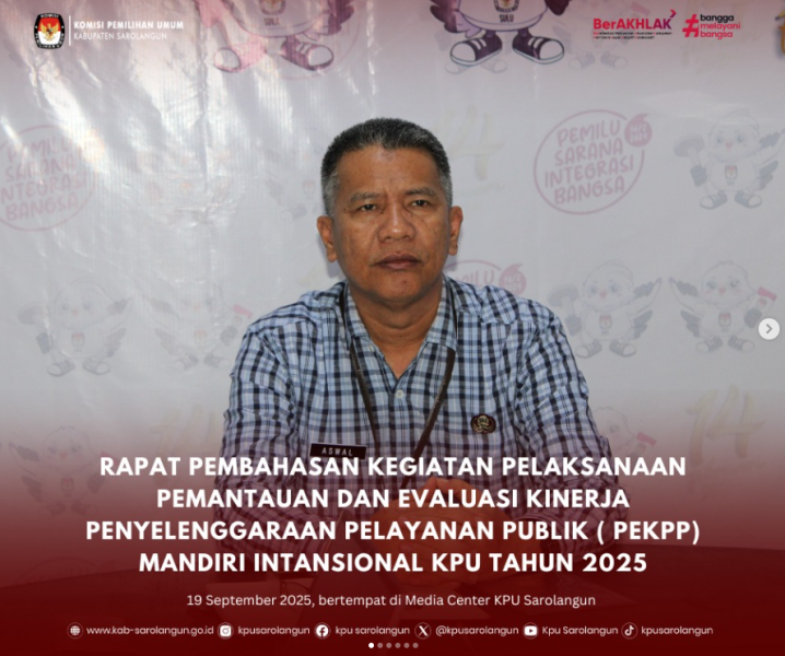 Sarolangun, kab-sarolangun.kpu.go.id - Komisi Pemilihan Umum (KPU) Kabupaten Sarolangun melaksanakan Rapat Pembahasan Kegiatan Pelaksanaan Pemantauan dan Evaluasi Kinerja Penyelenggaraan Pelayanan Publik ( PEKPP) Mandiri Intansional KPU Tahun 2025. Jum'at, (19/9/25)