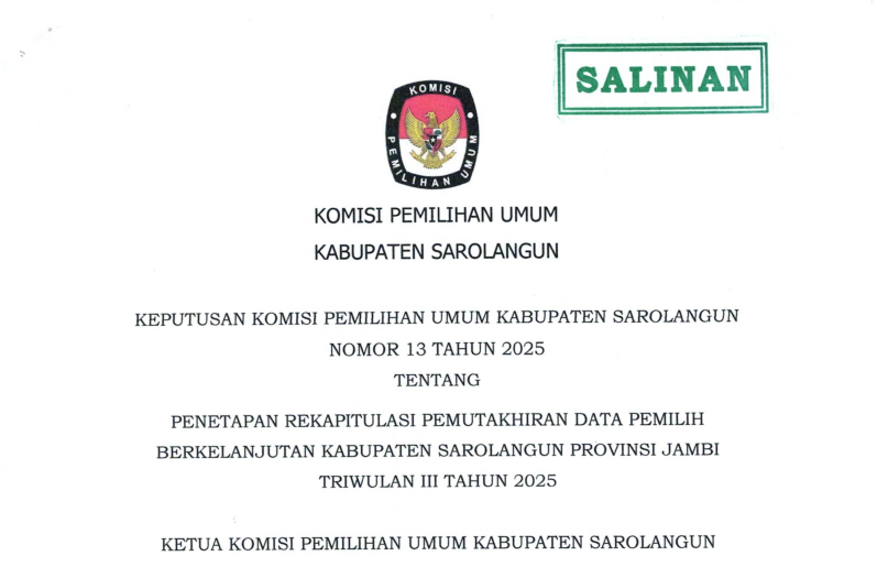 Penetapan dituangkan dalam surat Keputusan Komisi Pemilihan Umum Kabupaten Sarolangun Nomor 13 Tahun 2025 tentang Penetapan Rekapitulasi Pemutakhiran Data Pemilih Berkelanjutan Kabupaten Sarolangun Provinsi Jambi Triwulan III Tahun 2025 yang dapat dilihat di bawah ini dan dapat diunduh pada website JDIH KPU Kabupaten Sarolangun atau klik disini