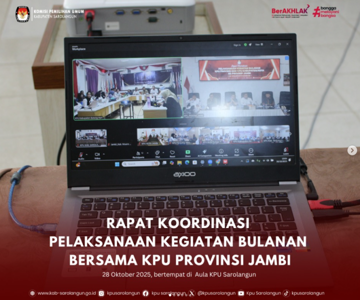 Komisi Pemilihan Umum (KPU) Kabupaten Sarolangun mengikuti Rapat Koordinasi (Rakor) Pelaksanaan Kegiatan Bulanan bersama KPU Provinsi Jambi. Acara penting ini digelar pada Kamis, 30 Oktober 2025, melalui Zoom Meeting.