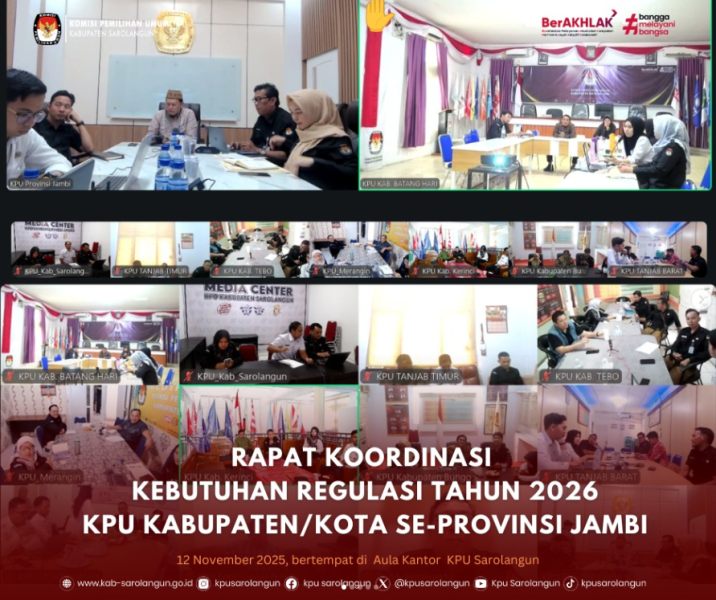 Sarolangun, kab-sarolangun.kpu.go.id - Komisi Pemilihan Umum Kabupaten Sarolangun mengikuti Rapat Koordinasi Kebutuhan Regulasi Tahun 2026 bersama KPU Provinsi dan KPU Kabupaten/Kota se-Provinsi Jambi pada Rabu, 12 November 2025, melalui Zoom Meeting.