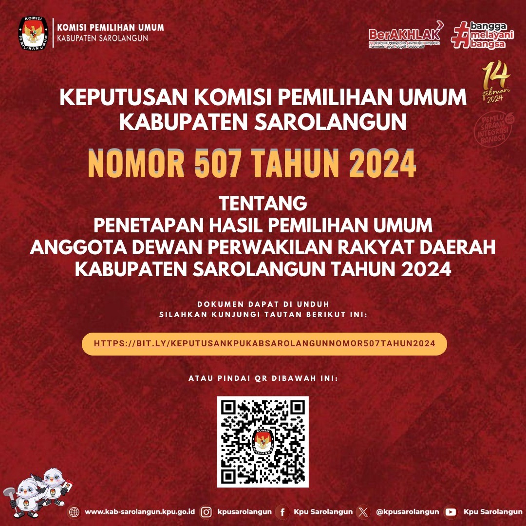 Keputusan Komisi Pemilihan Umum Kabupaten Sarolangun Nomor 507 Tahun 2024 tentang Penetapan Hasil Pemilihan Umum Anggota Dewan Perwakilan Rakyat Daerah Kabupaten Sarolangun Tahun 2024