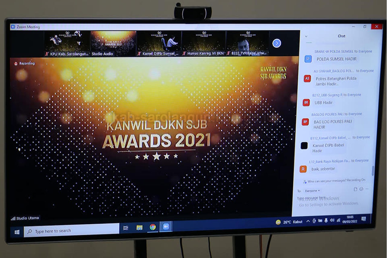 Sarolagun, kab-sarolangun.kpu.go.id – Kantor Wilayah (Kanwil) Direktorat Jenderal Kekayaan Negara Sumsel, Jambi dan Bangka Belitung (DJKN SJB) menyelenggarakan acara Kanwil DJKN SJB Award Tahun 2021 secara daring Rabu (9/3). Kanwil DJKN SJB bekerjasama dengan Kantor Pelayanan Kekayaan Negara dan Lelang (KPKNL) Provinsi Jambi, Palembang dan Bangka Belitung menyerahkan penghargaan terhadap satuan kerja dengan katagori pengelolaan barang milik negara BMN terbaik. Kegiatan DJKN SJB Award tersebut diikuti oleh satuan kerja penerima award beserta satuan kerja dibawah jajarannya, dalam wilayah Provinsi Jambi, Sumsel dan Babel. KPU Kabupaten Sarolangun juga turut serta dalam kegiatan tersesebut secara daring yang diikuti oleh Ibrahim, A.Anif dan Ali Wardana (Komisioner KPU Kab. Sarolangun) dan Sekretaris KPU Sarolangun Hery Sufadmi. Dalam kegiatan tersebut KPU Provinsi Jambi meraih juara tiga terbaik dengan kategori Laporan Pengawasan Wasdal barang milik negara periode tahun 2021. Pada sambutannya Kakanwil DJKN SJB menyampaikan, DJKN SJB Award diselenggarakan agar satuan kerja dalam wilayah kerjanya dapat meningkatkan kualitas laporan keuangan di bidang pengelolaan barang milik negara. (Dayat/Humas KPU Kab. Sarolangun).