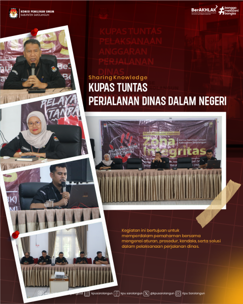 Sarolangun, kab-sarolangun.kpu.go.id – Komisi Pemilihan Umum (KPU) Kabupaten Sarolangun menggelar kegiatan Sharing Knowledge dengan tema “Kupas Tuntas Perjalanan Dinas Dalam Negeri”, yang berlangsung di aula KPU Sarolangun. Kegiatan ini bertujuan untuk memperdalam pemahaman bersama mengenai aturan, prosedur, kendala, serta solusi dalam pelaksanaan perjalanan dinas. Dalam kesempatan tersebut, Ahmad Jumadil hadir sebagai pemateri utama. Ia menyampaikan pentingnya transparansi, ketelitian administrasi, serta kepatuhan terhadap aturan dalam setiap pelaksanaan perjalanan dinas, agar tercipta tata kelola anggaran yang baik dan akuntabel. “Perjalanan dinas tidak hanya soal keberangkatan dan pelaporan, tetapi juga bagaimana memastikan setiap langkah sesuai aturan agar tidak menimbulkan persoalan di kemudian hari. Pemahaman bersama ini sangat penting bagi kita semua,” ungkap Ahmad Jumadil. Kegiatan diskusi ini juga diwarnai dengan sesi tanya jawab interaktif, di mana para peserta menyampaikan pengalaman, kendala, serta berbagai pertanyaan terkait teknis perjalanan dinas. Hal ini diharapkan mampu memberikan solusi praktis sekaligus menjadi ajang berbagi pengetahuan antarpeserta. Dengan adanya kegiatan Sharing Knowledge ini, KPU Sarolangun menegaskan komitmennya untuk terus mendorong tata kelola perjalanan dinas yang lebih tertib, transparan, dan sesuai aturan yang berlaku. (humas drs/foto cholied/ed Mutiyah)